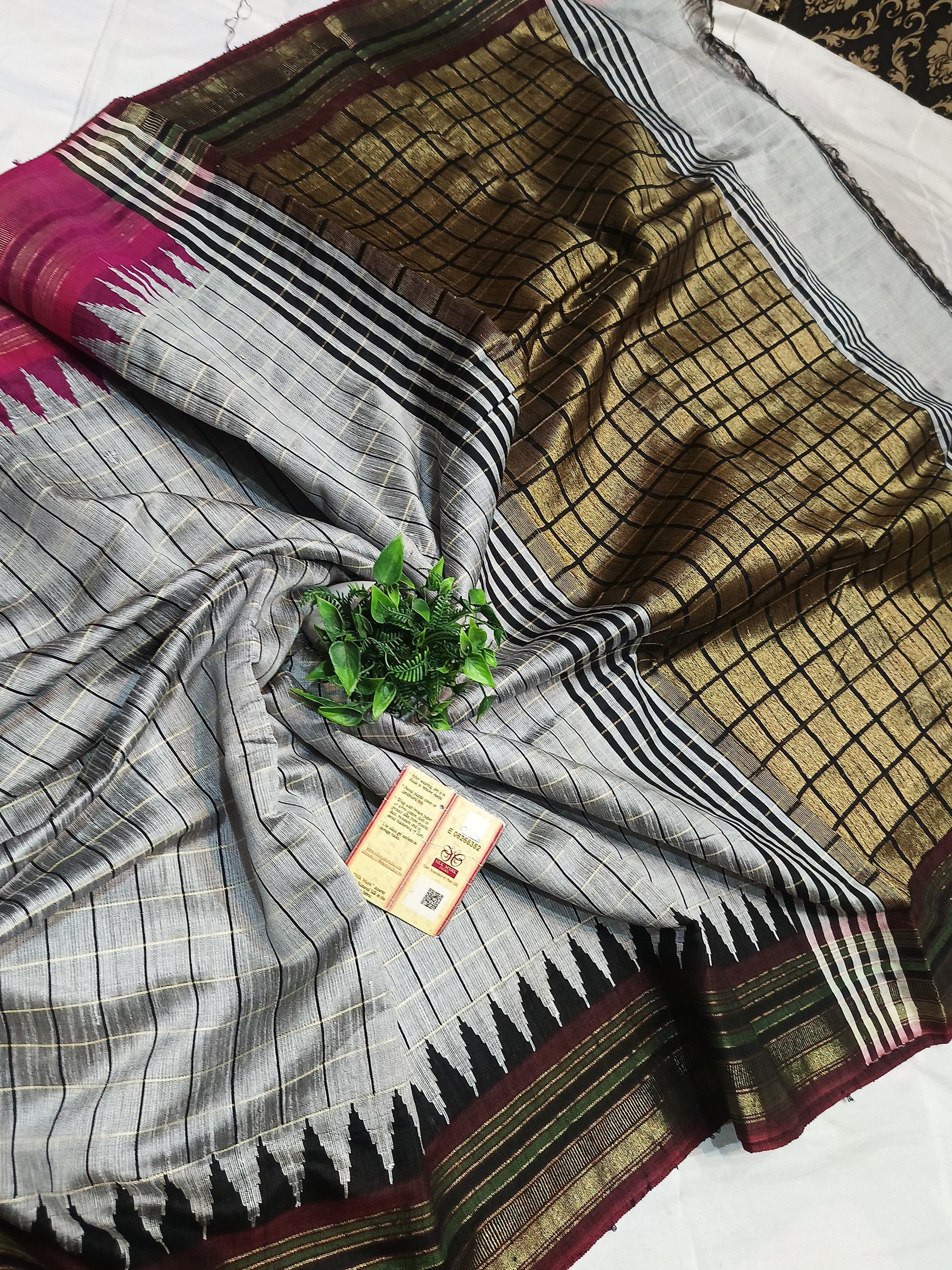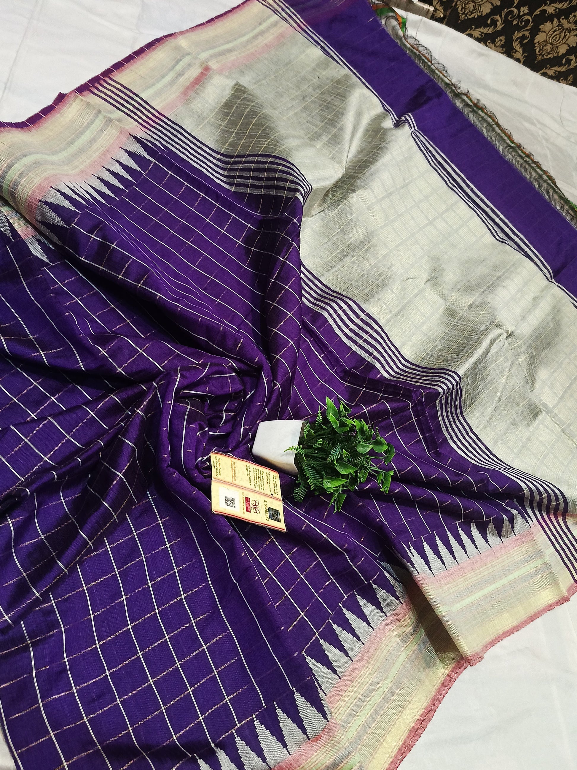 raw silk both side temple border and body checks with Contrast pallu blouse